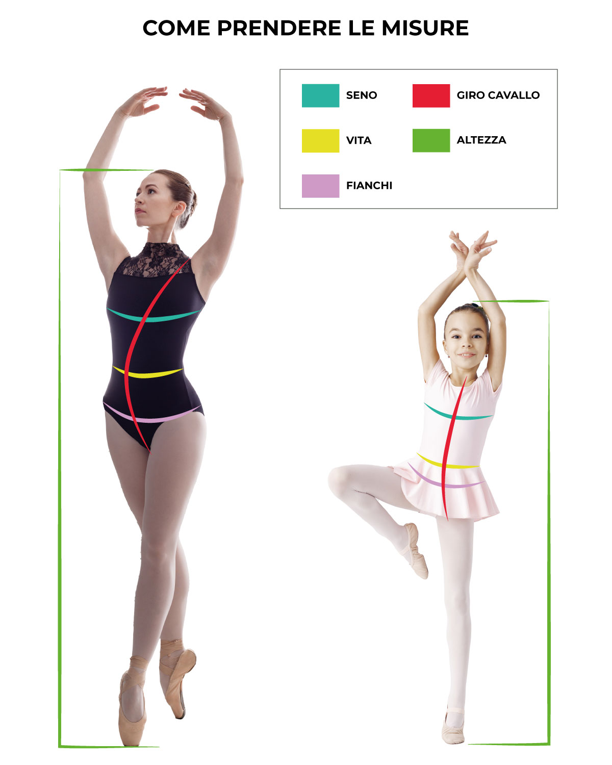 Soprattutto quando ordini un body, un tutù o un costume su misura, prendi attentamente le misure per ogni sezione indicata.